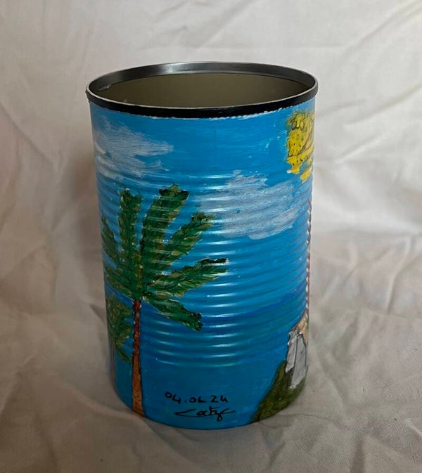 Pot à crayons de la collection Commune peint à la main et vernis sur un support conserve recyclée.