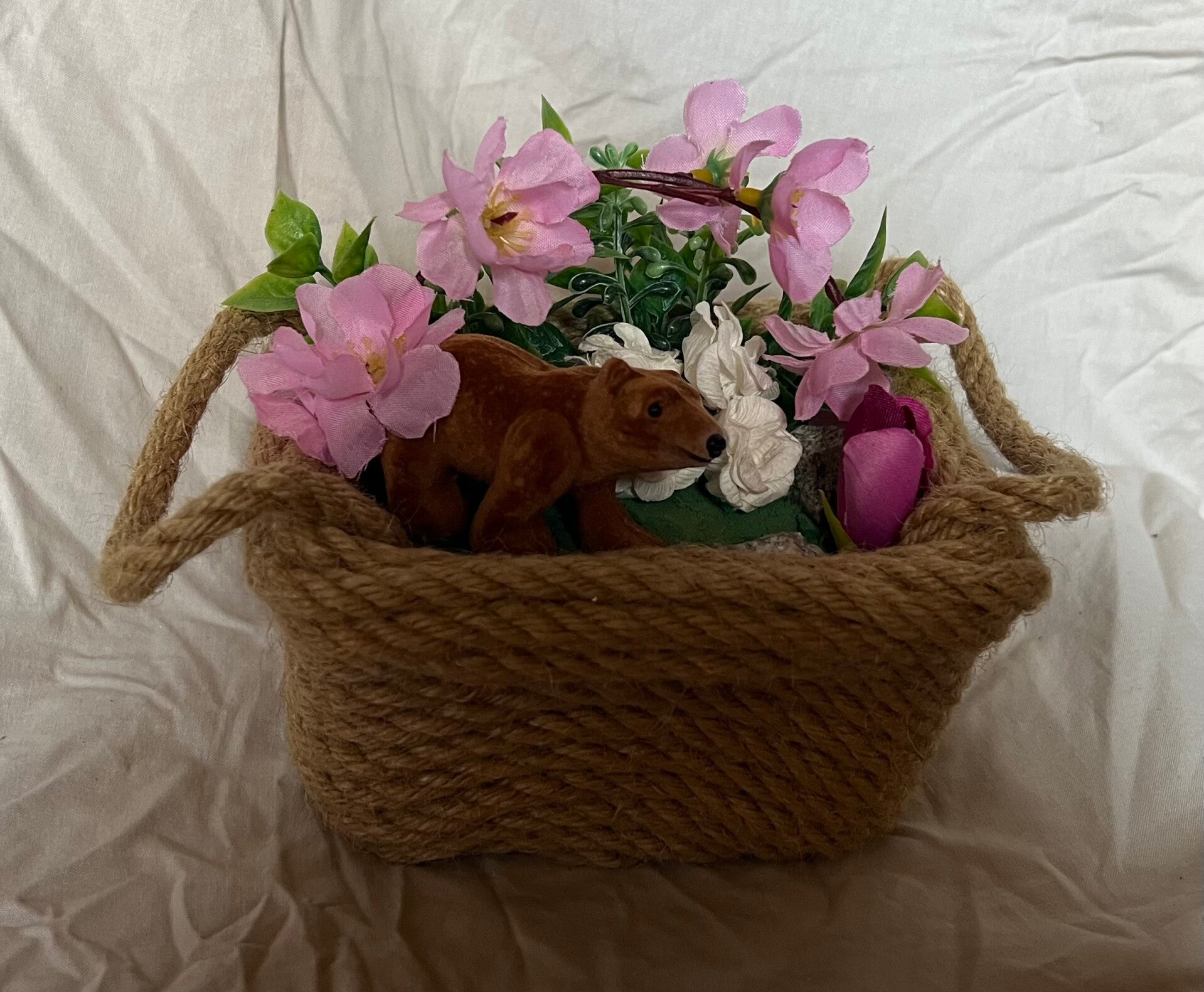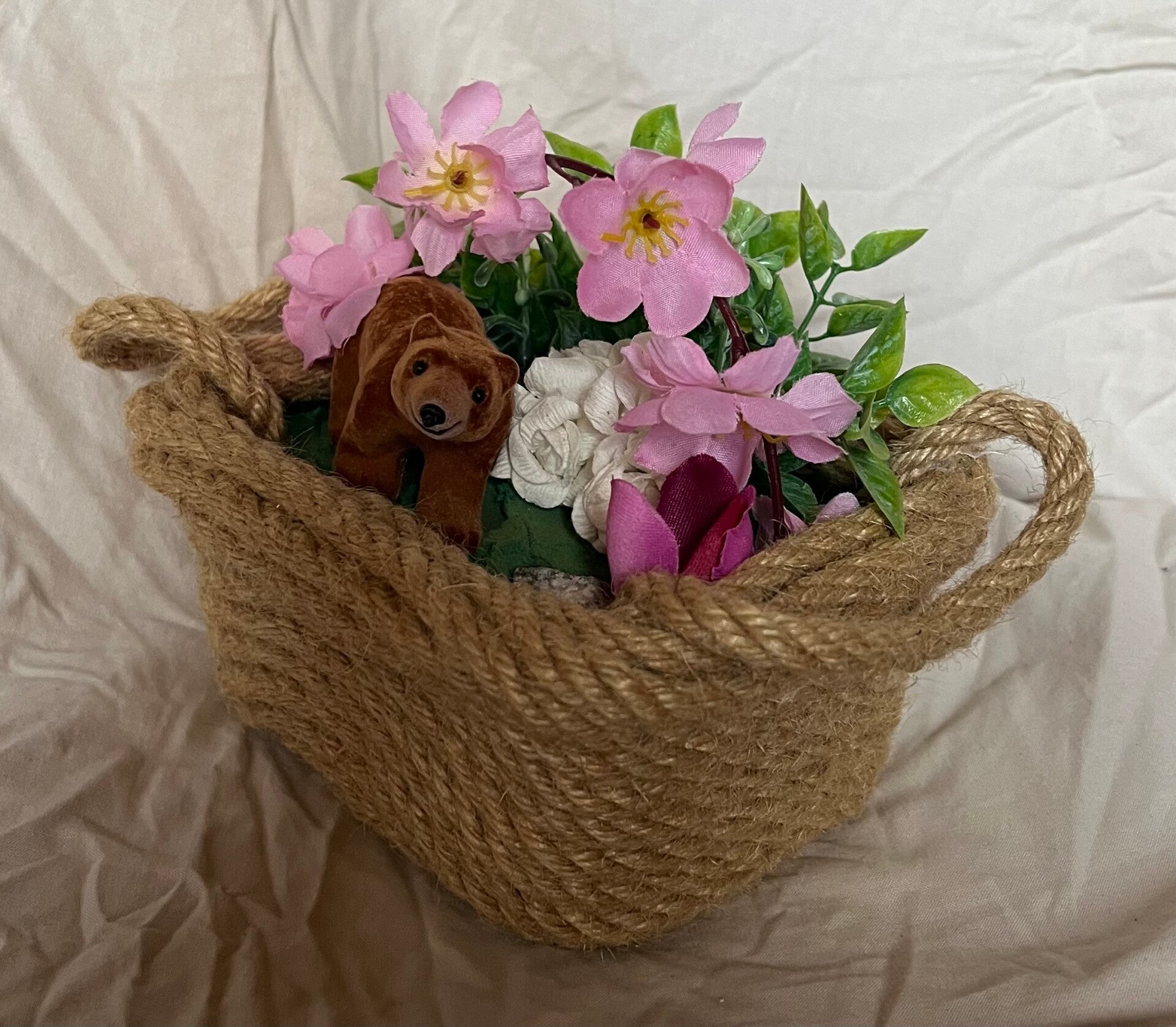 Ce jolie panier décoratif avec son petit ours sous une arche fleurie, le tout fait main donnera une touche printanière à votre intérieur.