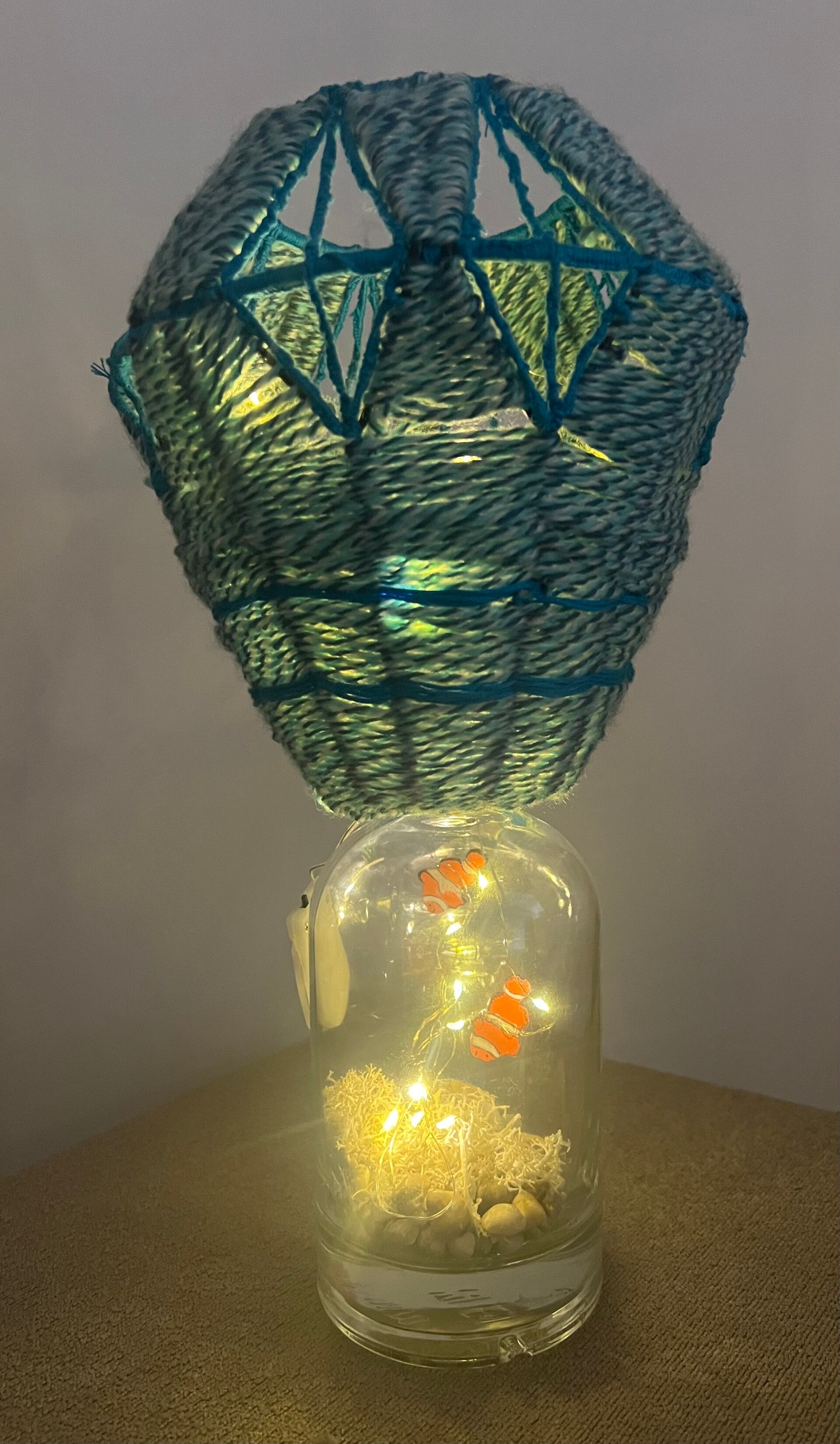 Lampe d'ambiance Océan réalisée partir d'une bouteille en verre recyclé avec décor intérieur artisanal, d'un abat jour tissé à la main et de deux guirlandes led.