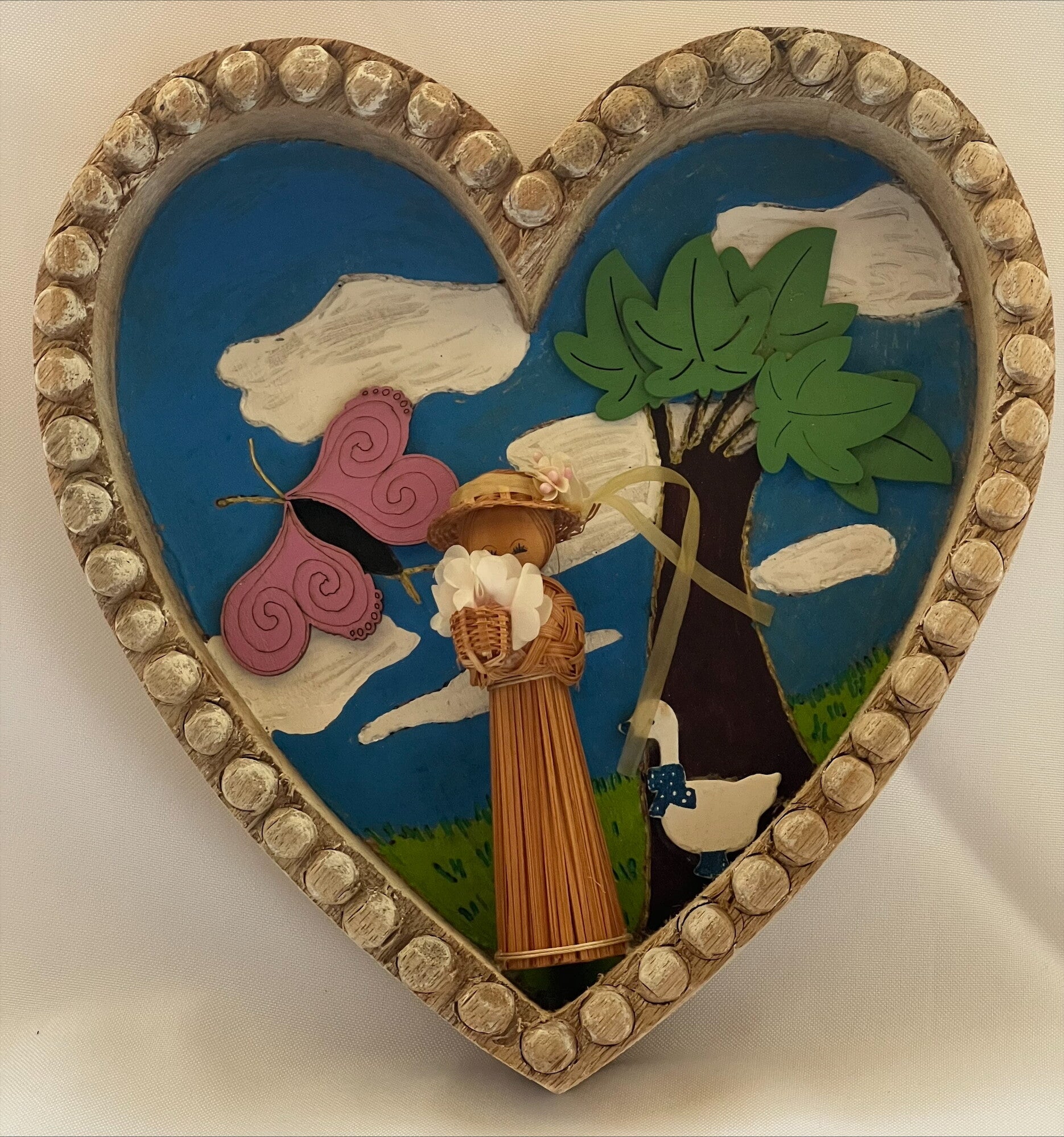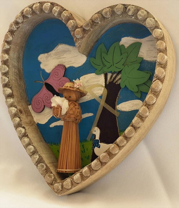 Tableau décoratif en 3D réalisé sur un support en bois peint à la main avec une poupée et de petits éléments en bois.