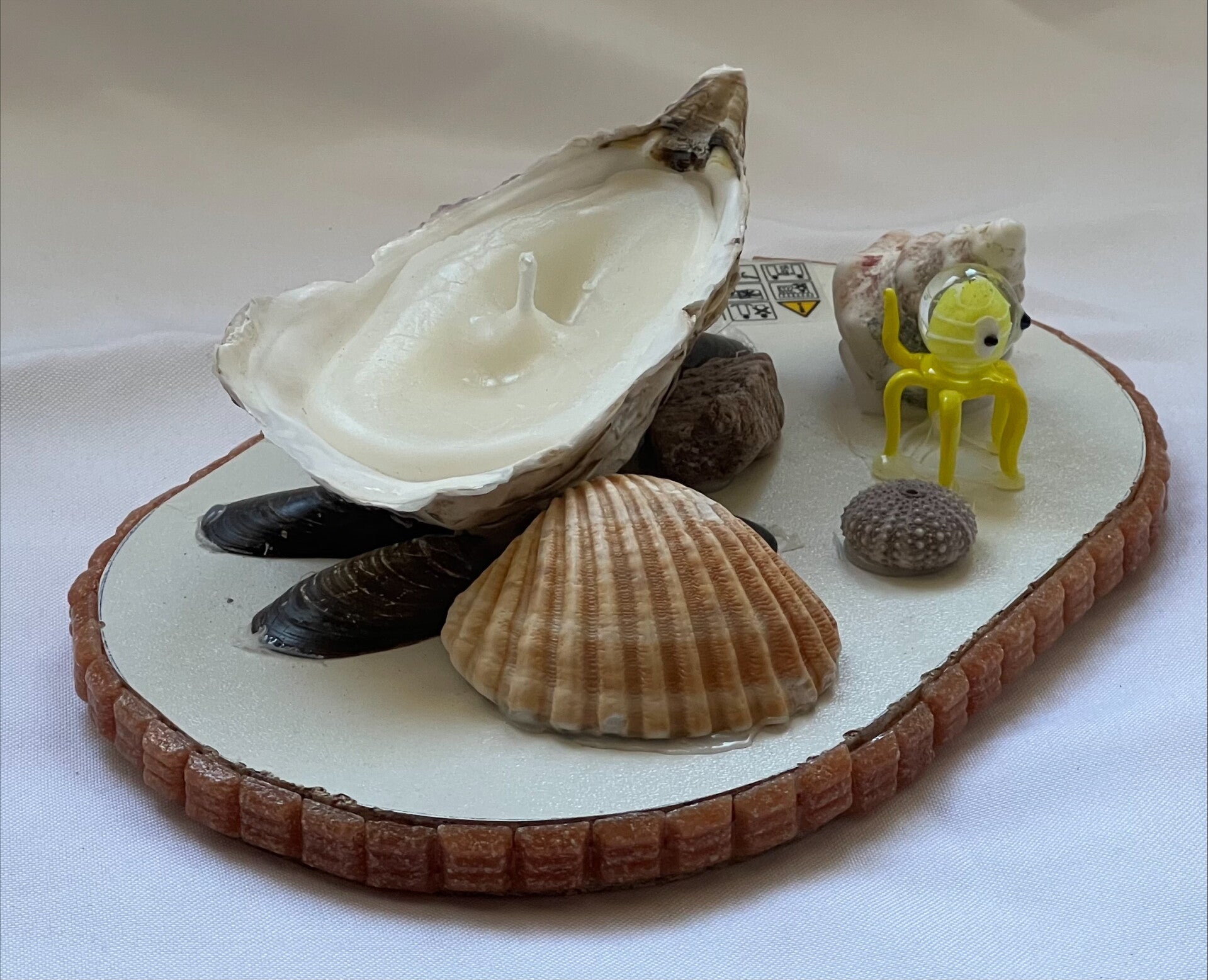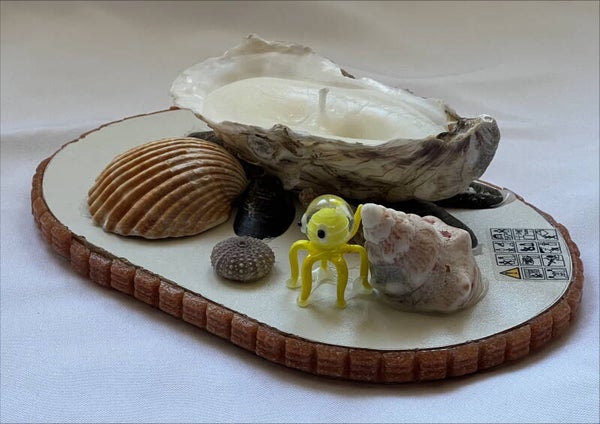 Cette décoration faite main avec sa bougie artisanale dans une huître et sa petite pieuvre jaune entourée de véritables coquillages ajoutera une touche marin à votre décoration d'intérieur.