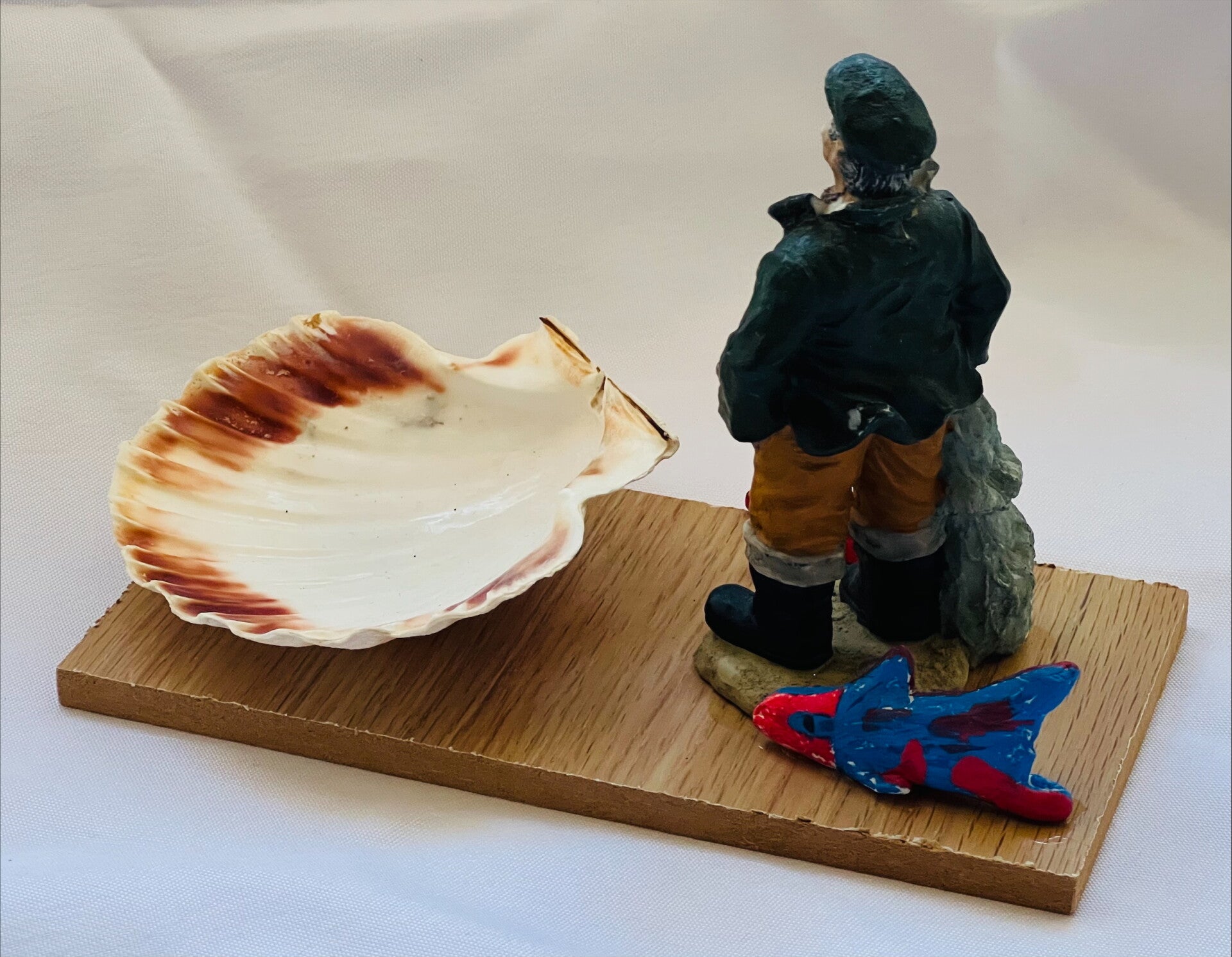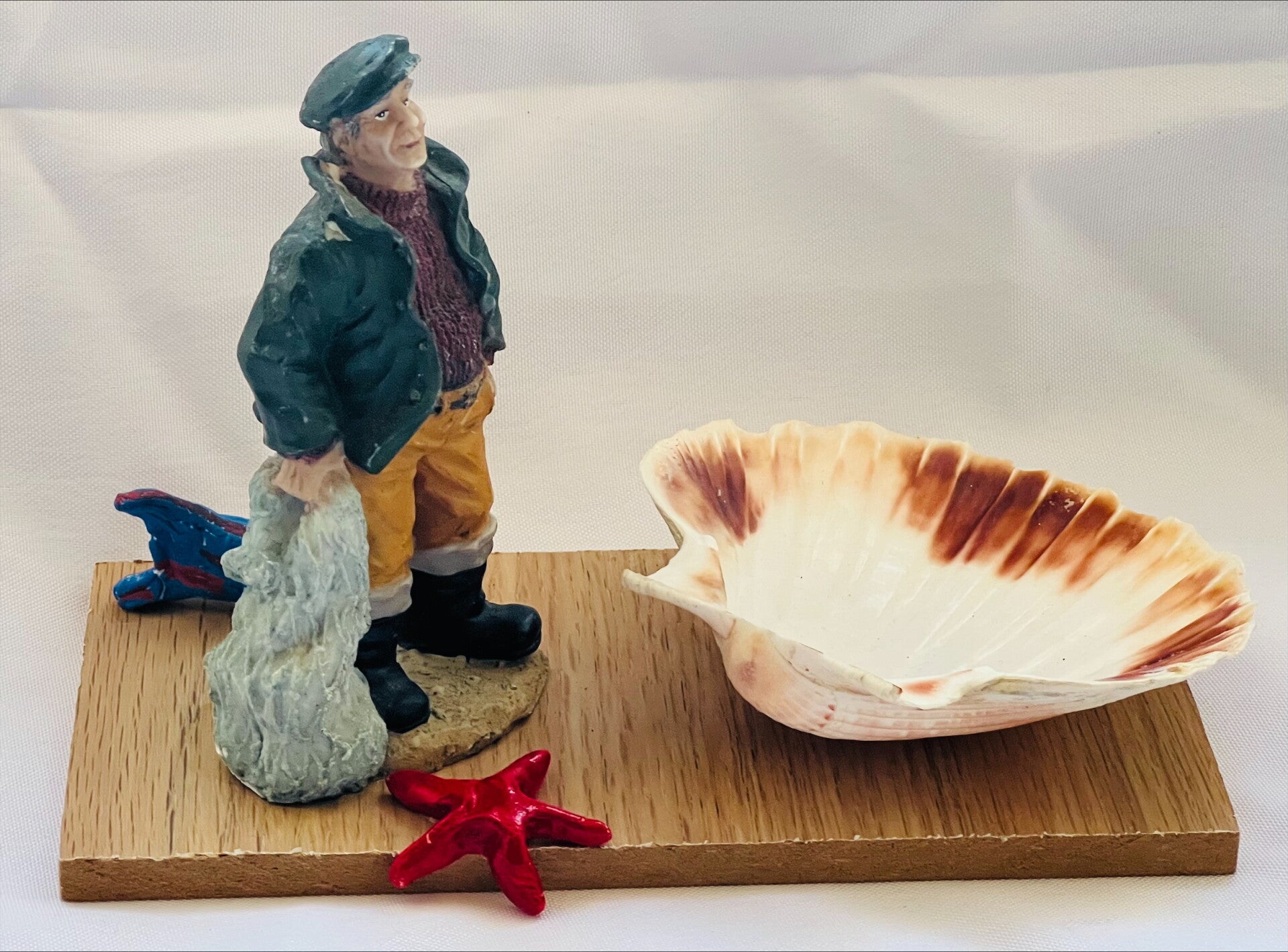 Décoration sur le thème de la pêche et de la mer, accompagnée d'une veritable coquille St Jacques pouvant servir de vide-poche ou de cendrier.